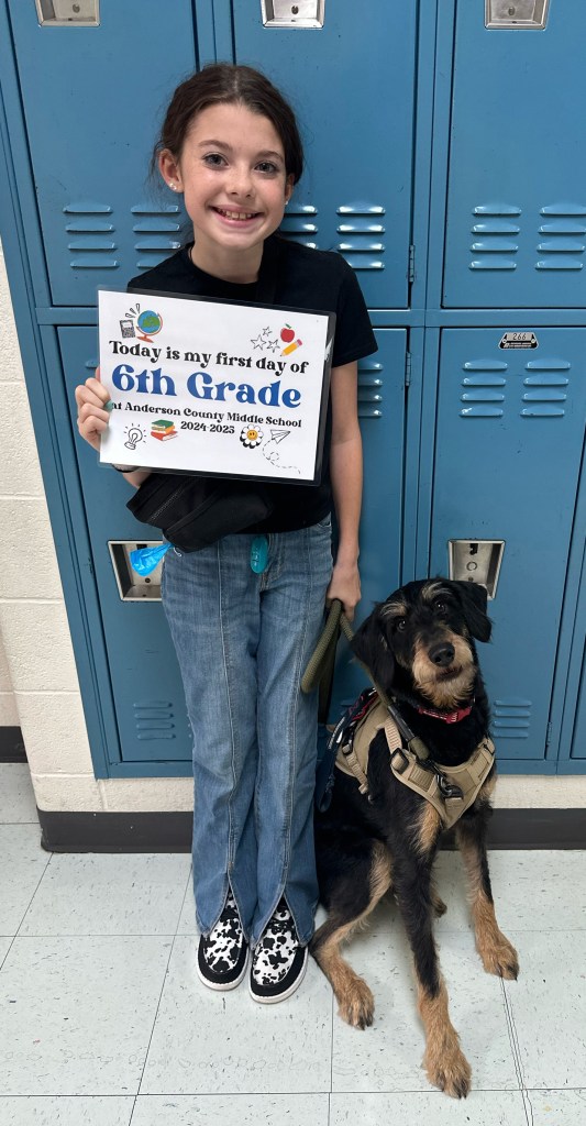 Apollo is a one-year-old “Dobiedoodle” trained by Liz Norris with Pawsibilities Unleashed in Frankfort. His handler, Izzabella, has a rare genetic disorder called Stickler Syndrome. Apollo helps with protecting Izzabella by watching for cars that she may not hear (she is partially deaf), alerting for drops in her blood pressure or heart rate, mobility assistance, and blocking and covering when strangers approach.