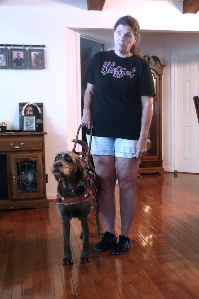 While service dogs are generally trained to be on the left side of their handler, Shelly needed a dog that could be trained for her right side, since she has no vision in her right eye and limited vision in the left.
