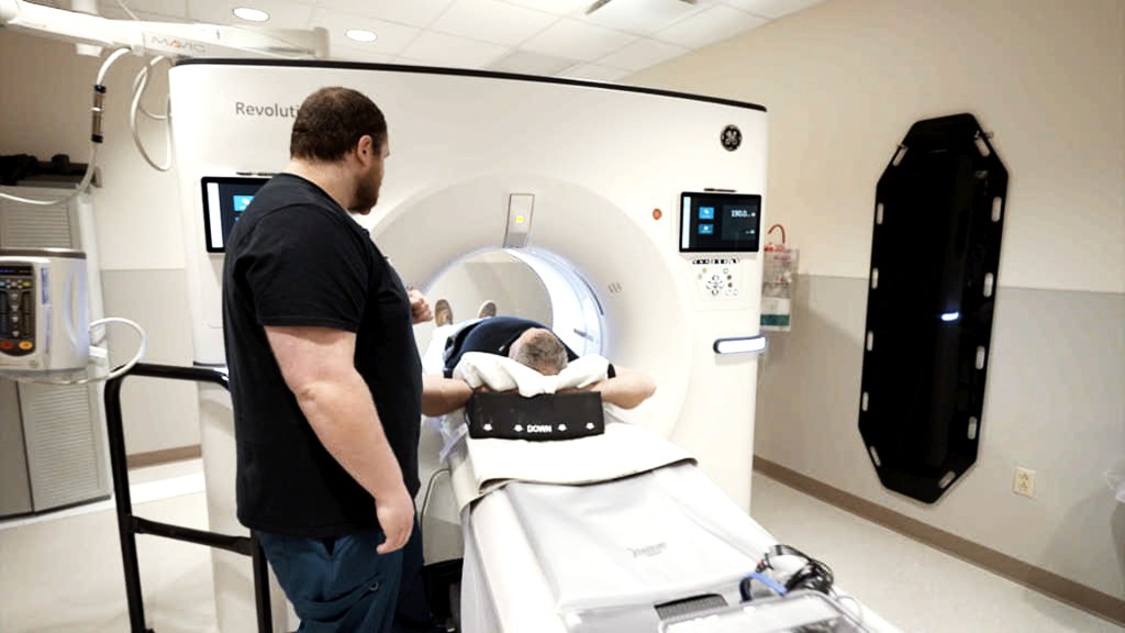 Nathan Bennett, FACHE, CPPS, RT, Senior Director of Imaging Services at Lake Cumberland Regional Hospital, demonstrates the CT256 scanner. (Submitted photo)