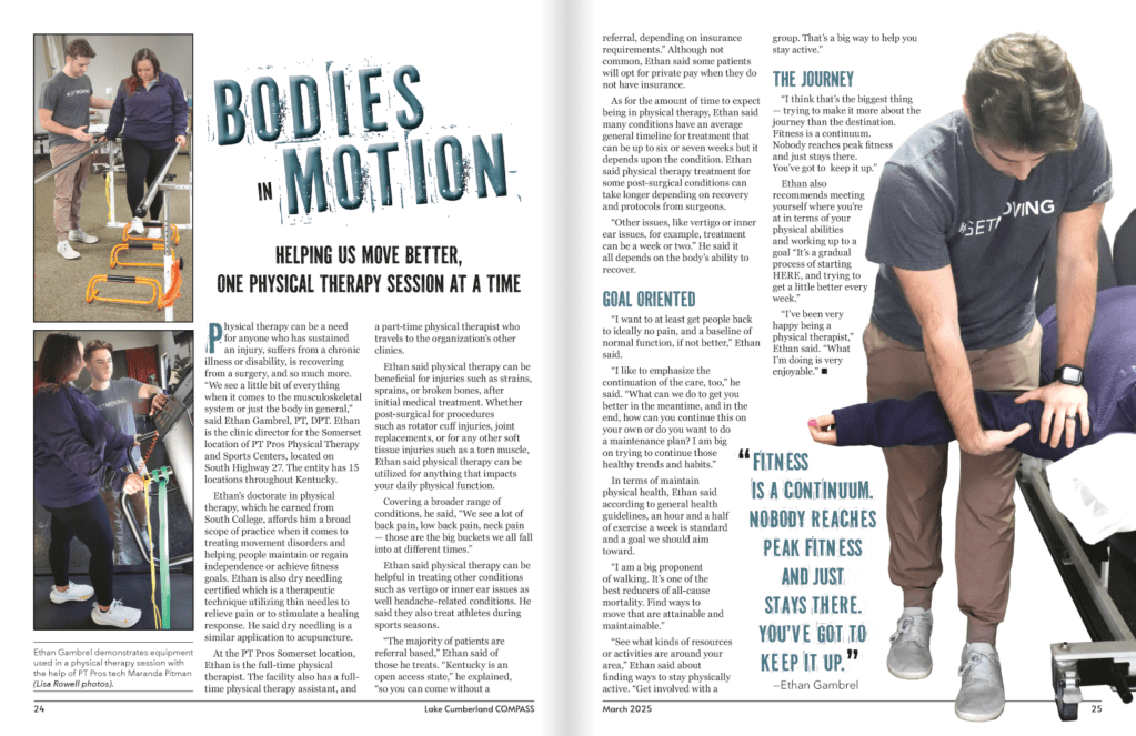 Physical therapy can be a need for anyone who has sustained an injury, suffers from a chronic illness or disability, is recovering from a surgery, and so much more. “We see a little bit of everything when it comes to the musculoskeletal system or just the body in general,” said Ethan Gambrel, PT, DPT. Ethan is the clinic director for the Somerset location of PT Pros Physical Therapy and Sports Centers, located on South Highway 27. The entity has 15 locations throughout Kentucky.